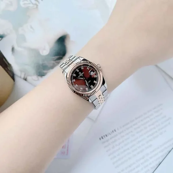 - Mặt số: Màu nâu với hiệu ứng sunburst tạo chiều sâu và ánh sáng phản chiếu đẹp mắt.